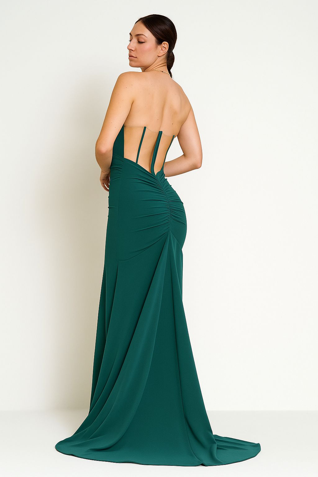 Abito a sirena, verde oliva o nero, sensuale e sofisticato allo stesso tempo. Bustino a cuore, steccato che finisce in un taglio morbido nella parte inferiore dell’abito.